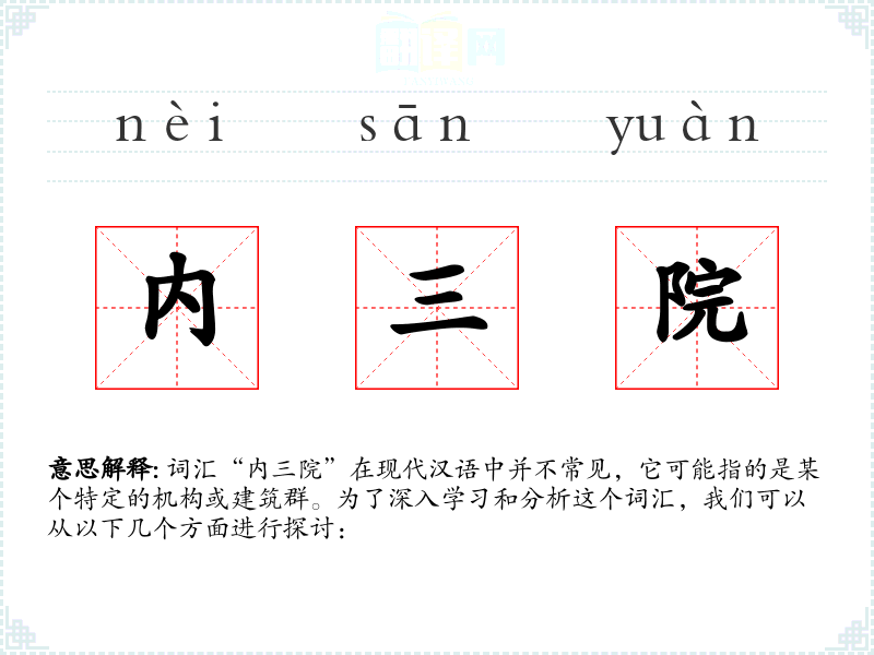 词汇“内三院”在现代汉语中并不常见,它可能指的是某个特定的机构或建筑群。为了深入学*和分析这个词汇,我们可以从以下几个方面进行探讨: