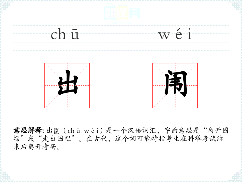 出圍(chū wéi)是一个汉语词汇,字面意思是“离开围场”或“走出围栏”。在古代,这个词可能特指考生在科举考试结束后离开考场。