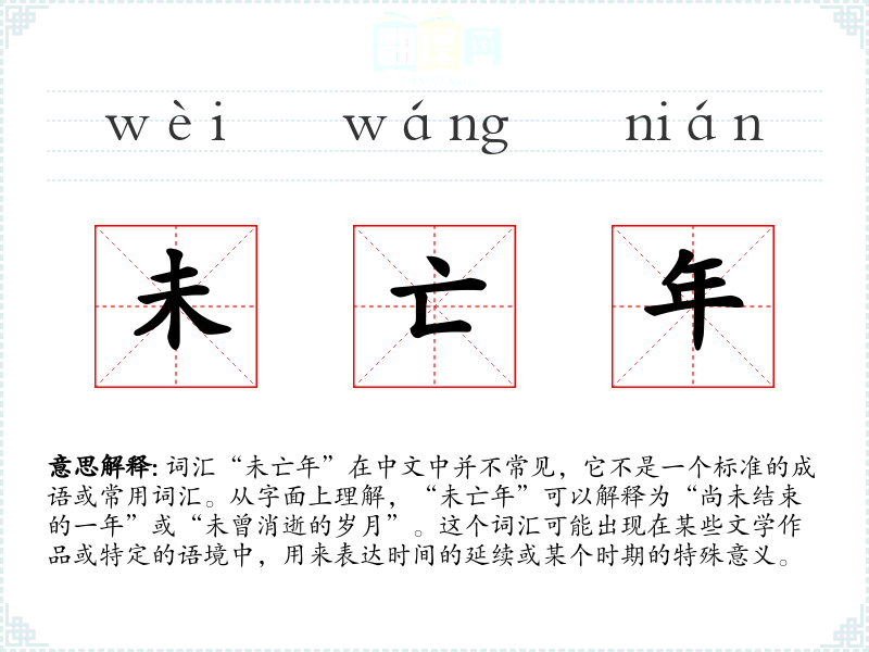 词汇“未亡年”在中文中并不常见,它不是一个标准的成语或常用词汇。从字面上理解,“未亡年”可以解释为“尚未结束的一年”或“未曾消逝的岁月”。这个词汇可能出现在某些文学作品或特定的语境中,用来表达时间的延续或某个时期的特殊意义。