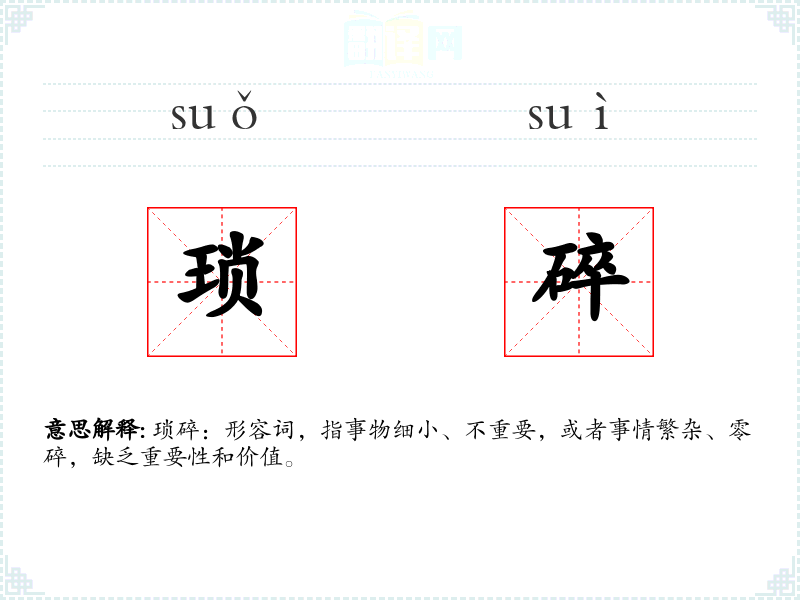 琐碎:形容词,指事物细小、不重要,或者事情繁杂、零碎,缺乏重要性和价值。