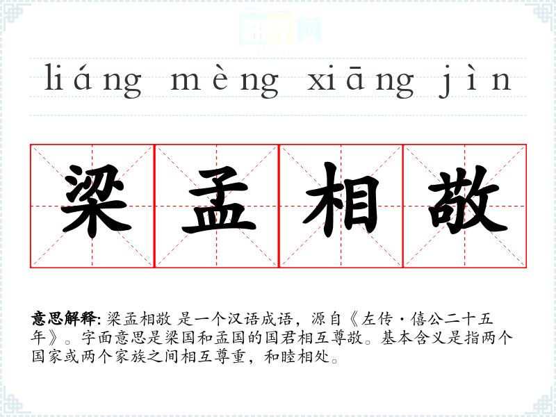 梁孟相敬 是一个汉语成语,源自《左传·僖公二十五年》。字面意思是梁国和孟国的国君相互尊敬。基本含义是指两个国家或两个家族之间相互尊重,和睦相处。