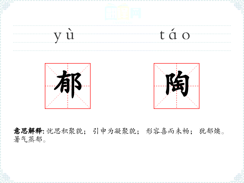 忧思积聚貌; 引申为凝聚貌; 形容喜而未畅; 犹郁燠。暑气蒸郁。