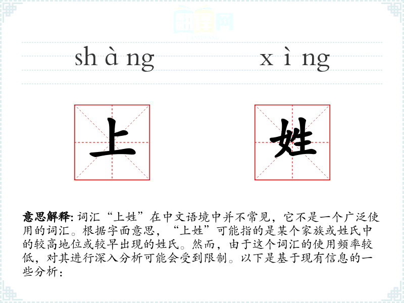 “上姓”的词源可能与古代**的家族制度和姓氏体系有关。在古代,姓氏往往与社会地位和家族历史紧密相关,因此“上姓”可能指的是那些历史悠久、地位显赫的姓氏。