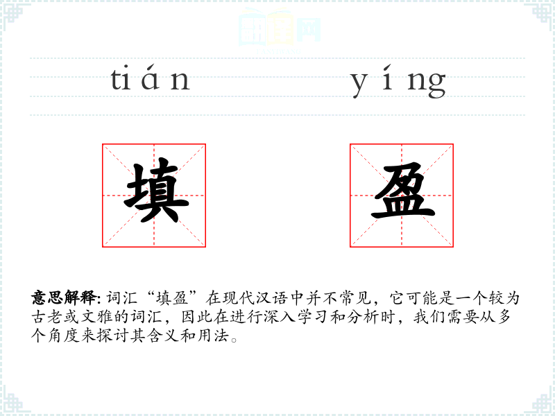 词汇“填盈”在现代汉语中并不常见,它可能是一个较为古老或文雅的词汇,因此在进行深入学*和分析时,我们需要从多个角度来探讨其含义和用法。
