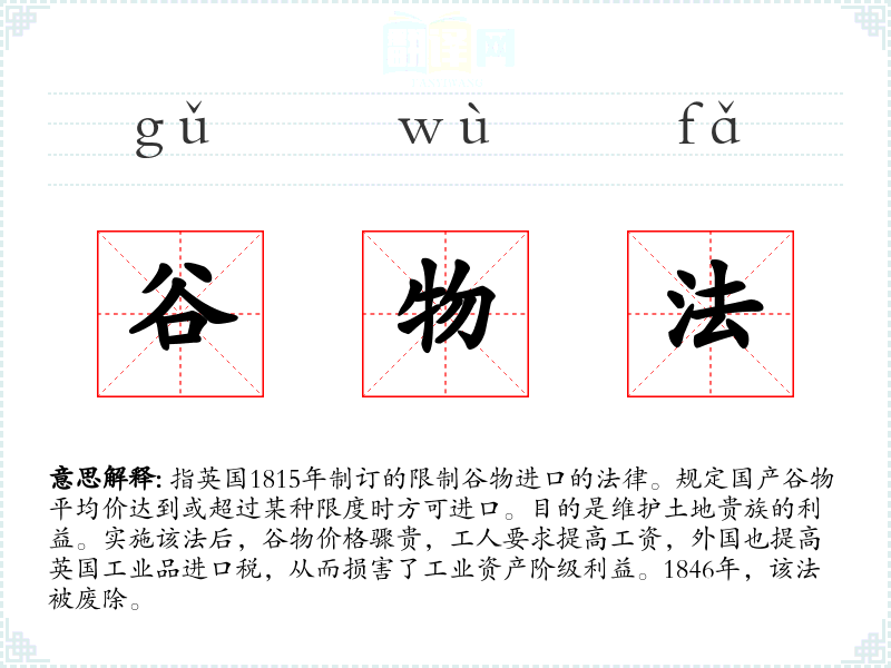 1.指英国1815年制订的限制谷物进口的法律。规定国产谷物平均价达到或超过某种限度时方可进口。目的是维护土地贵族的利益。实施该法后,谷物价格骤贵,工人要求提高工资,外国也提高英国工业品进口税,从而损害了工业资产阶级利益。1846年,该法被废除。