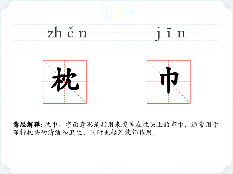 枕巾:字面意思是指用来覆盖在枕头上的布巾,通常用于保持枕头的清洁和卫生,同时也起到装饰作用。