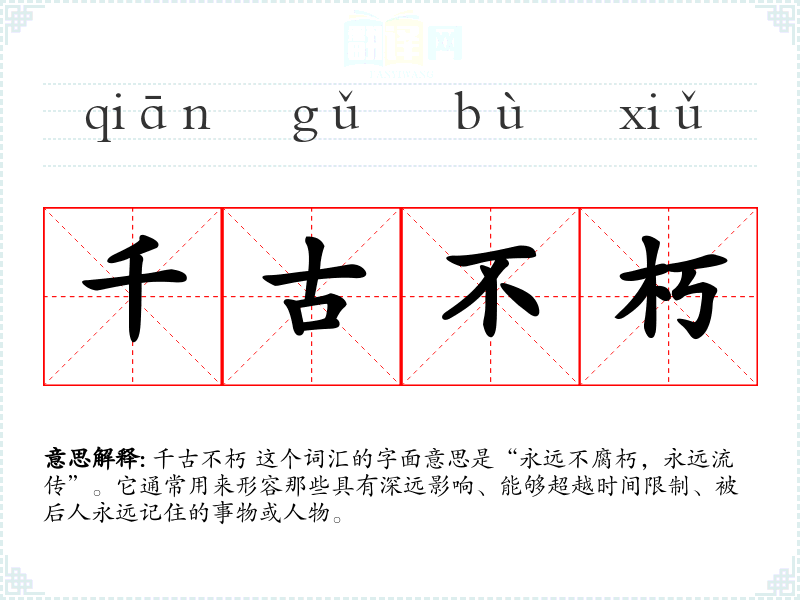 千古不朽 这个词汇的字面意思是“永远不腐朽,永远流传”。它通常用来形容那些具有深远影响、能够超越时间限制、被后人永远记住的事物或人物。