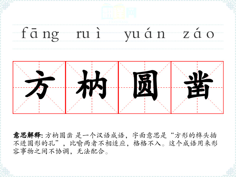 方枘圆凿 出自《楚辞·离骚》:“夫唯捷径以窘步兮,方枘圆凿而难入。”原意是指政治上的正直与奸诈之间的不协调。随着时间的推移,这个成语的含义扩展到更广泛的领域,用来描述任何形式的不协调。