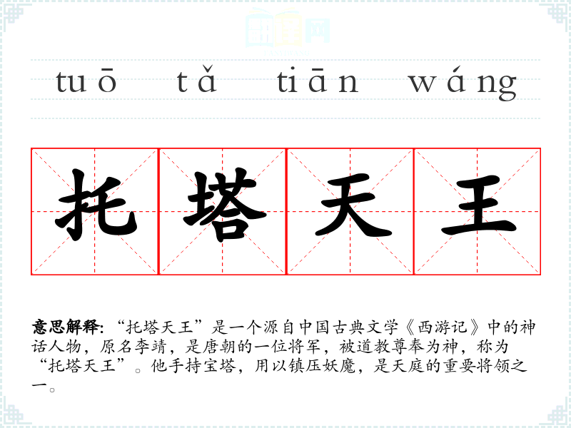 “托塔天王”是一个源自古典文学《西游记》中的神话人物,原名李靖,是唐朝的一位将军,被道教尊奉为神,称为“托塔天王”。他手持宝塔,用以妖魔,是天庭的重要将领之一。