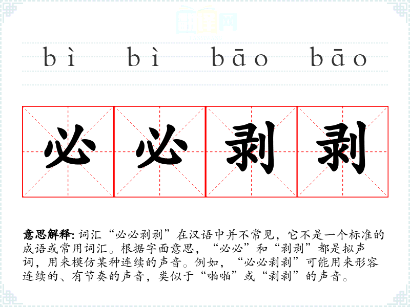 词汇“必必剥剥”在汉语中并不常见,它不是一个标准的成语或常用词汇。根据字面意思,“必必”和“剥剥”都是拟声词,用来模仿某种连续的声音。例如,“必必剥剥”可能用来形容连续的、有节奏的声音,类似于“啪啪”或“剥剥”的声音。