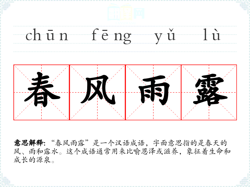 “春风雨露”是一个汉语成语,字面意思指的是春天的风、雨和露水。这个成语通常用来比喻恩泽或滋养,象征着生命和成长的源泉。
