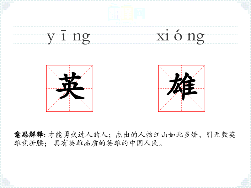 才能勇武过人的人;杰出的人物江山如此多娇,引无数英雄竞折腰; 具有英雄品质的英雄的中国人民。