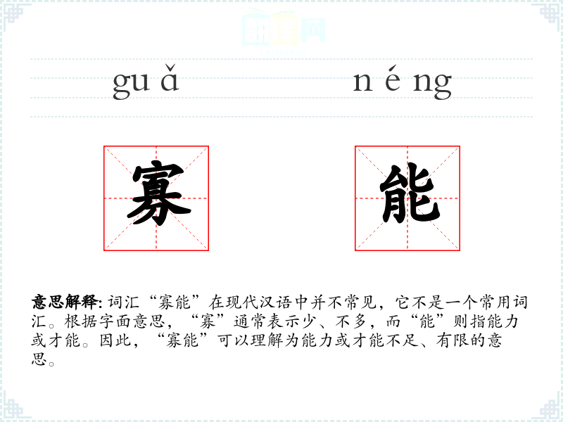 词汇“寡能”在现代汉语中并不常见,它不是一个常用词汇。根据字面意思,“寡”通常表示少、不多,而“能”则指能力或才能。因此,“寡能”可以理解为能力或才能不足、有限的意思。