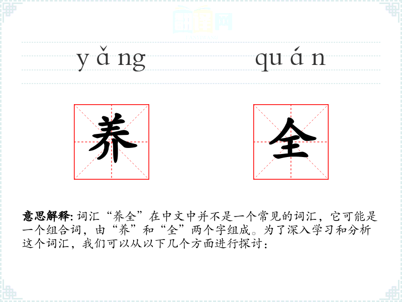 词汇“养全”在中文中并不是一个常见的词汇,它可能是一个组合词,由“养”和“全”两个字组成。为了深入学习和分析这个词汇,我们可以从以下几个方面进行探讨: