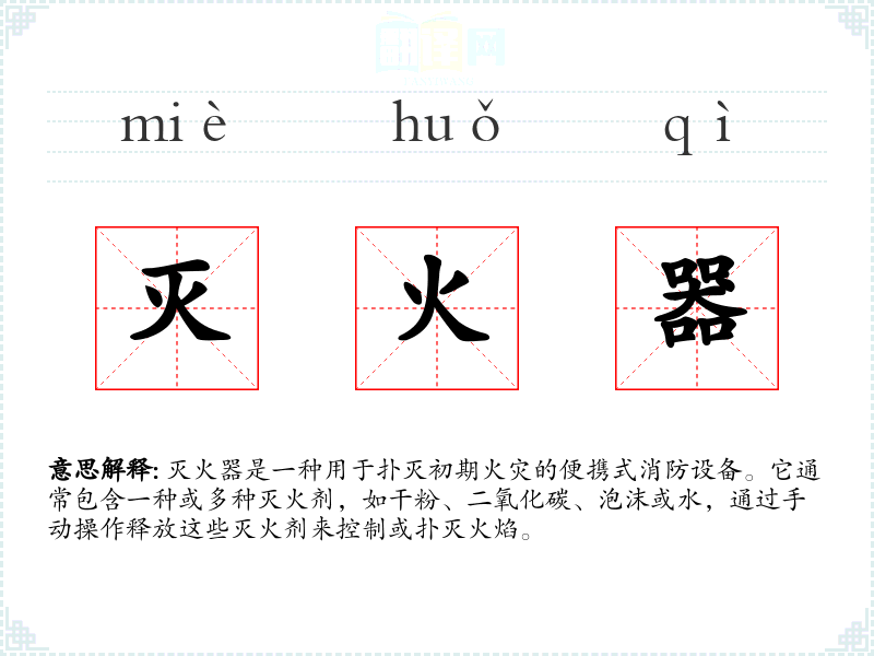 - 反义词:点火器、引火物(这些词汇与灭火器的功能相反,用于引发火灾)