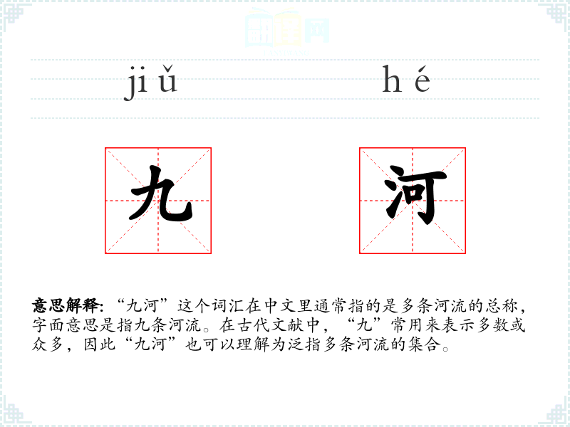 “九河”这个词汇在中文里通常指的是多条河流的总称,字面意思是指九条河流。在古代文献中,“九”常用来表示多数或众多,因此“九河”也可以理解为泛指多条河流的集合。