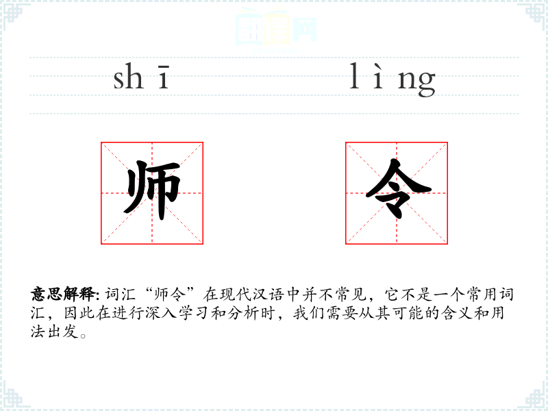 由于“师令”不是一个常用词汇,它在现代汉语中的使用场景较为有限。可能出现在较为正式或古风的文学作品中,或者在某些特定的教育、军事或**语境中。