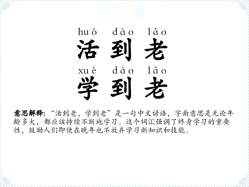 “活到老,学到老”是一句中文谚语,字面意思是无论年龄多大,都应该持续不断地学。这个词汇强调了终身学的重要性,鼓励人们即使在晚年也不放弃学*新知识和技能。