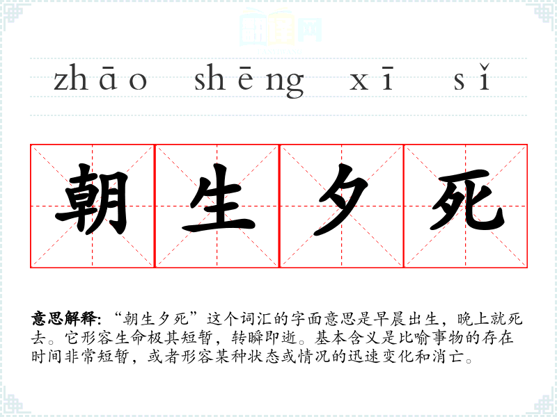 “朝生夕死”这个词汇的字面意思是早晨出生,晚上就死去。它形容生命极其短暂,转瞬即逝。基本含义是比喻事物的存在时间非常短暂,或者形容某种状态或情况的迅速变化和消亡。