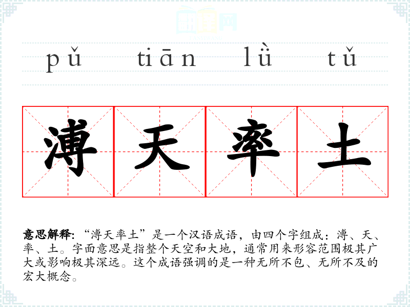 “溥天率土”是一个汉语成语,由四个字组成:溥、天、率、土。字面意思是指整个天空和大地,通常用来形容范围极其广大或影响极其深远。这个成语强调的是一种无所不包、无所不及的宏大概念。