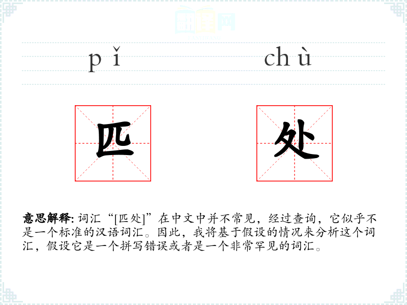 词汇“[匹处]”在中文中并不常见,经过查询,它似乎不是一个标准的汉语词汇。因此,我将基于假设的情况来分析这个词汇,假设它是一个拼写错误或者是一个非常罕见的词汇。