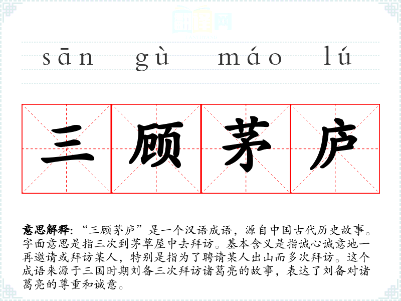 “三顾茅庐”这个成语源自《三国志·蜀志·诸葛亮传》,记载了刘备为了请诸葛亮出山辅佐,三次亲自到诸葛亮的茅庐中去拜访的故事。这个成语自此成为汉语中表达诚心诚意和尊重的典型用语。