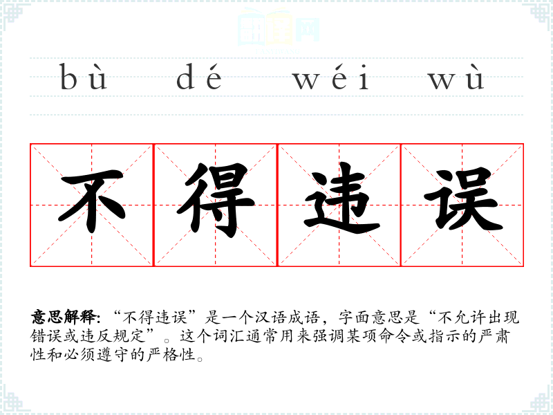 “不得违误”是一个汉语成语,字面意思是“不允许出现错误或违反规定”。这个词汇通常用来强调某项命令或指示的严肃性和必须遵守的严格性。
