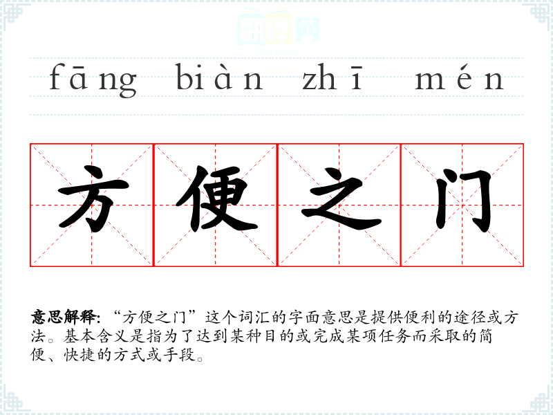 “方便之门”这个词汇的字面意思是提供便利的途径或方法。基本含义是指为了达到某种目的或完成某项任务而采取的简便、快捷的方式或手段。