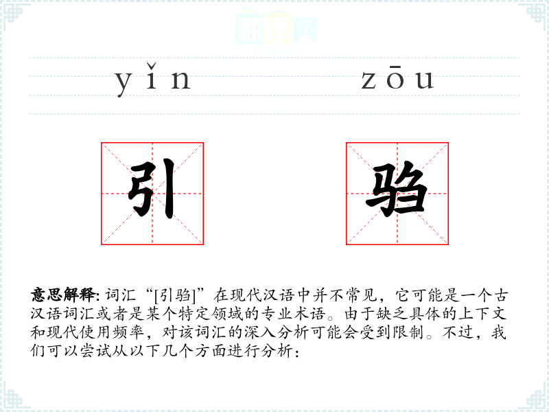 词汇“[引驺]”在现代汉语中并不常见,它可能是一个古汉语词汇或者是某个特定领域的专业术语。由于缺乏具体的上下文和现代使用频率,对该词汇的深入分析可能会受到限制。不过,我们可以尝试从以下几个方面进行分析: