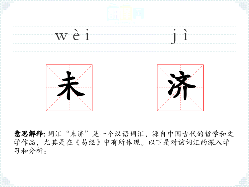词汇“未济”是一个汉语词汇,源自*古代的哲学和文学作品,尤其是在《易经》中有所体现。以下是对该词汇的深入学和分析: