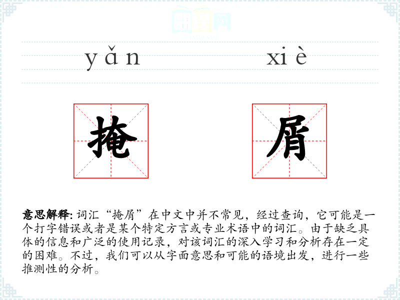 词汇“掩屑”在中文中并不常见,经过查询,它可能是一个打字错误或者是某个特定方言或专业术语中的词汇。由于缺乏具体的信息和广泛的使用记录,对该词汇的深入学习和分析存在一定的困难。不过,我们可以从字面意思和可能的语境出发,进行一些推测性的分析。