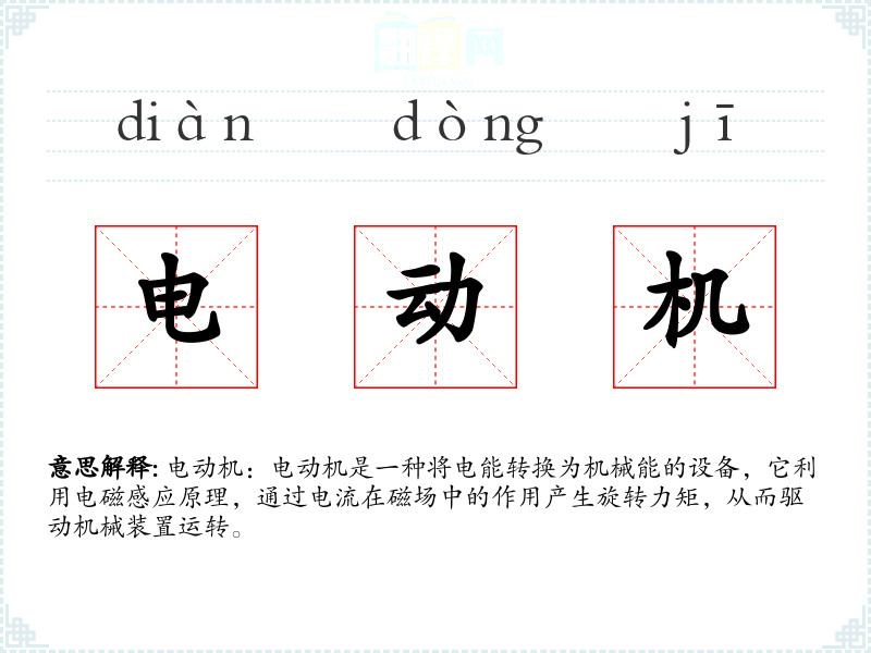 - 词源:“电动机”一词源于英语“electric motor”,其中“electric”意为电的,“motor”意为驱动器或发动机。