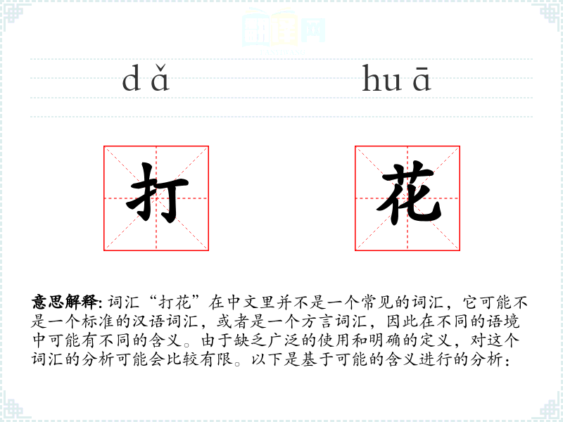 词汇“打花”在中文里并不是一个常见的词汇,它可能不是一个标准的汉语词汇,或者是一个方言词汇,因此在不同的语境中可能有不同的含义。由于缺乏广泛的使用和明确的定义,对这个词汇的分析可能会比较有限。以下是基于可能的含义进行的分析: