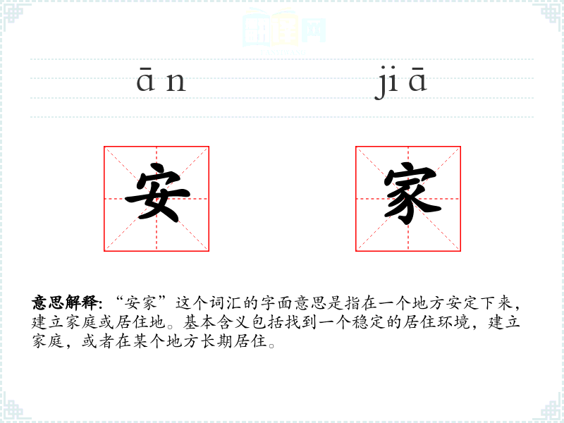 “安家”这个词汇的字面意思是指在一个地方安定下来,建立家庭或居住地。基本含义包括找到一个稳定的居住环境,建立家庭,或者在某个地方长期居住。