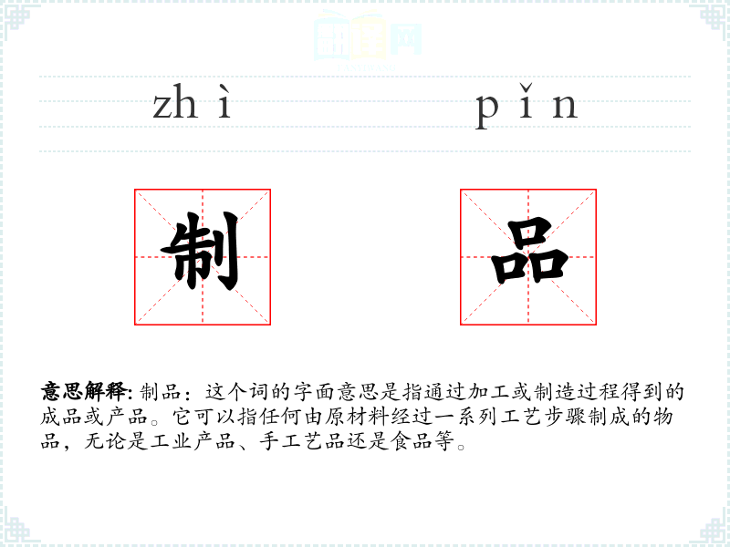 制品:这个词的字面意思是指通过加工或制造过程得到的成品或产品。它可以指任何由原材料经过一系列工艺步骤制成的物品,无论是工业产品、手工艺品还是食品等。