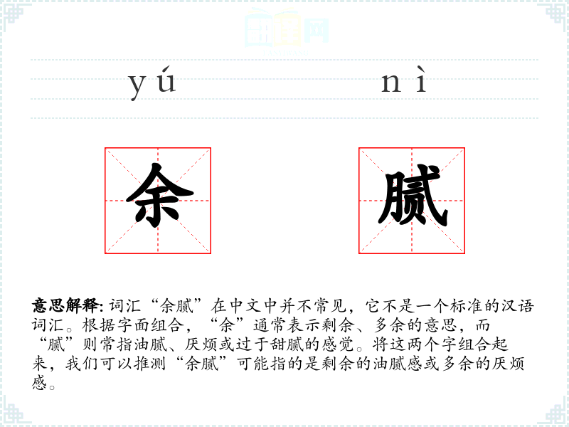 由于“余腻”不是一个通用词汇,它在不同语言或文化中的对应词汇可能不存在。