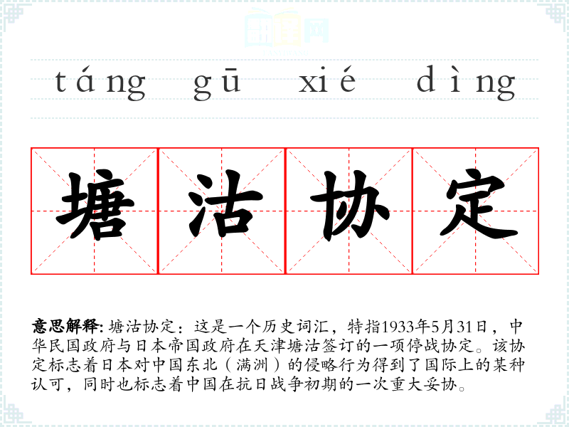 塘沽协定:这是一个历史词汇,特指1933年5月31日,中华民国政府与日本帝国政府在天津塘沽签订的一项停战协定。该协定标志着日本对东北(满洲)的侵略行为得到了国际上的某种认可,同时也标志着在抗日战争初期的一次重大妥协。