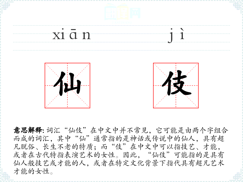 - 词源:“仙”源自古代神话中的仙人,“伎”源自古代对表演艺术者的称呼。