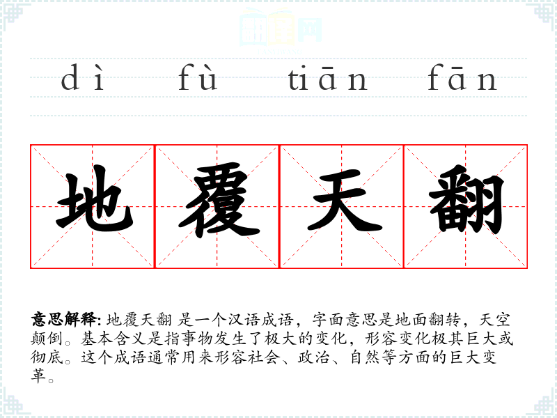 地覆天翻 是一个汉语成语,字面意思是地面翻转,天空颠倒。基本含义是指事物发生了极大的变化,形容变化极其巨大或彻底。这个成语通常用来形容社会、政治、自然等方面的巨大变革。