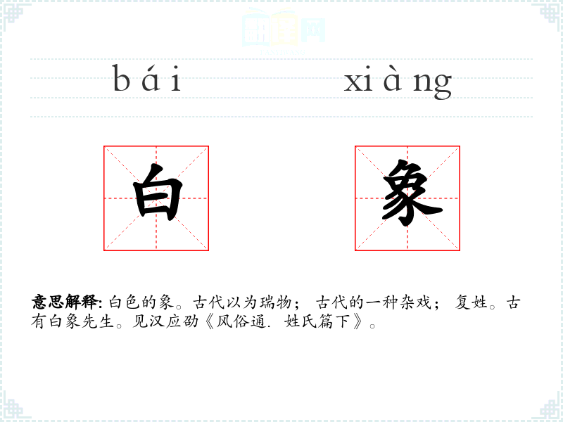 白色的象。古代以为瑞物; 古代的一种杂戏; 复姓。古有白象先生。见汉应劭《风俗通.姓氏篇下》。