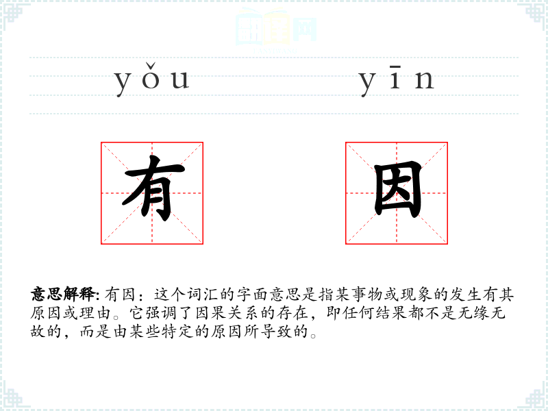 有因:这个词汇的字面意思是指某事物或现象的发生有其原因或理由。它强调了因果关系的存在,即任何结果都不是无缘无故的,而是由某些特定的原因所导致的。