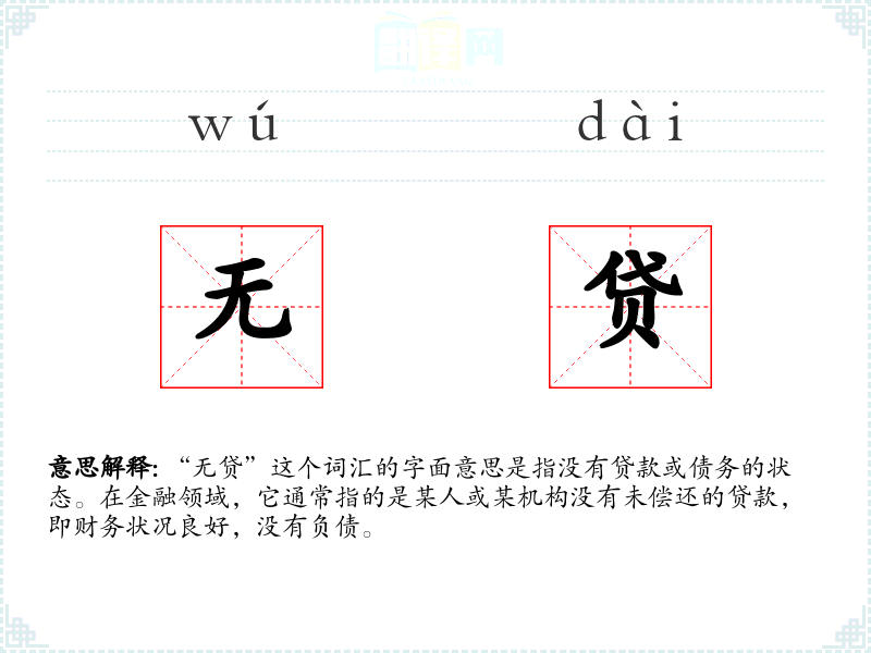 “无贷”这个词汇的字面意思是指没有贷款或债务的状态。在金融领域,它通常指的是某人或某机构没有未偿还的贷款,即财务状况良好,没有负债。