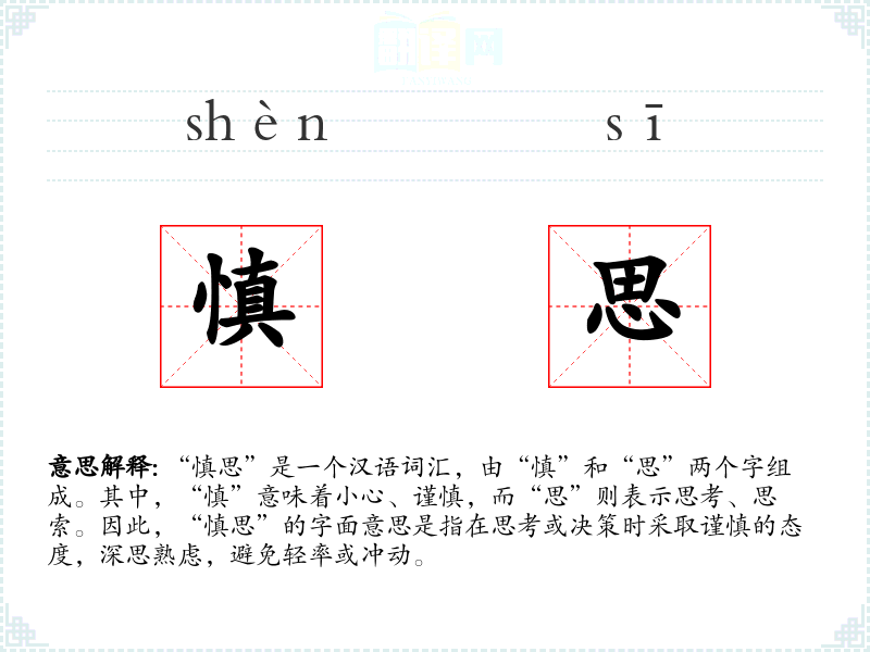 在英语中,“慎思”可以对应为“deliberate”或“cautious consideration”。这些词汇也强调了在决策前的仔细思考和谨慎态度。
