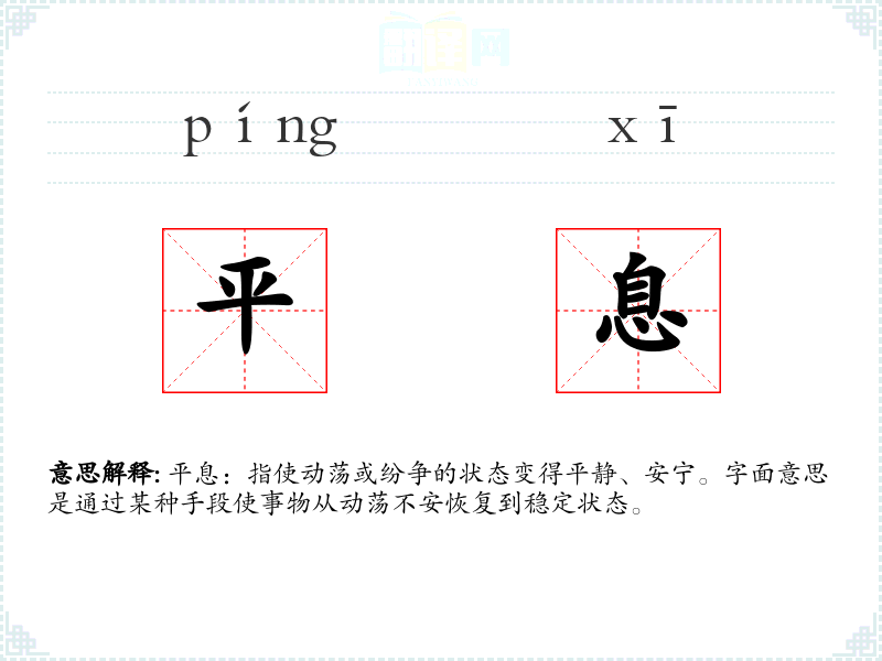 平息:指使动荡或纷争的状态变得平静、安宁。字面意思是通过某种手段使事物从动荡不安恢复到稳定状态。