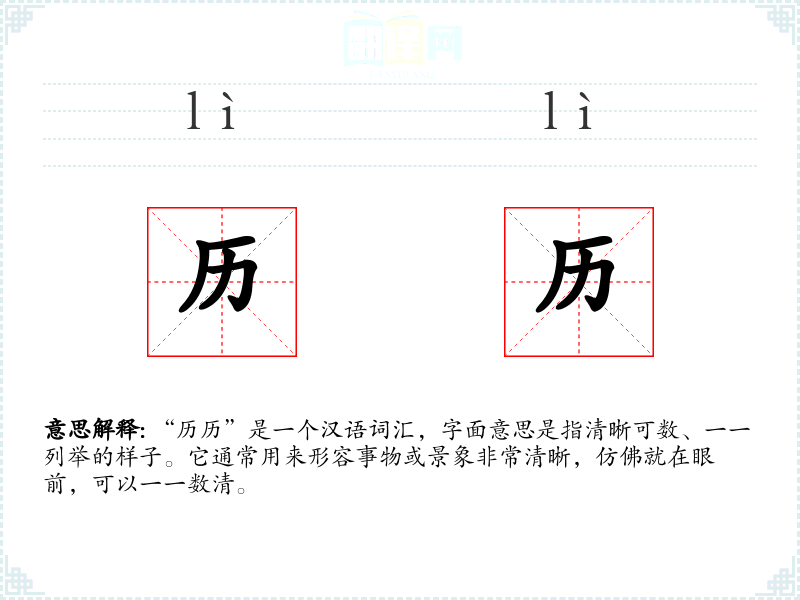“历历”是一个汉语词汇,字面意思是指清晰可数、一一列举的样子。它通常用来形容事物或景象非常清晰,仿佛就在眼前,可以一一数清。