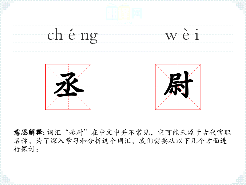 词汇“丞尉”在中文中并不常见,它可能来源于古代官职名称。为了深入学*和分析这个词汇,我们需要从以下几个方面进行探讨: