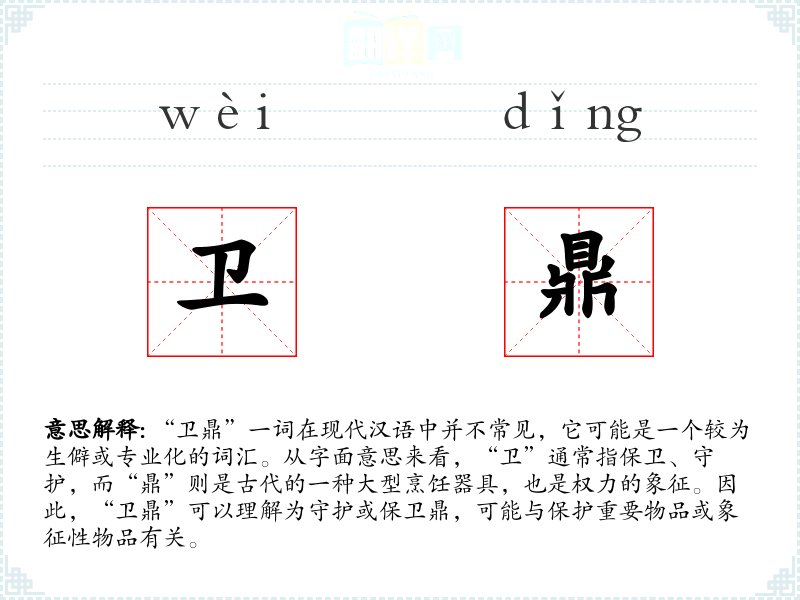 在文化中,鼎是权力和地位的象征,因此“卫鼎”可能与保护国家或家族的重要象征物有关。在社会背景中,这个词汇可能与历史或文化遗产的保护有关。