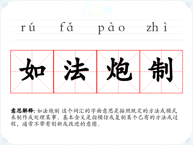 如法炮制 这个词汇的字面意思是按照既定的方法或模式来制作或处理某事。基本含义是指模仿或复制某个已有的方法或过程,通常不带有创新或改进的意图。