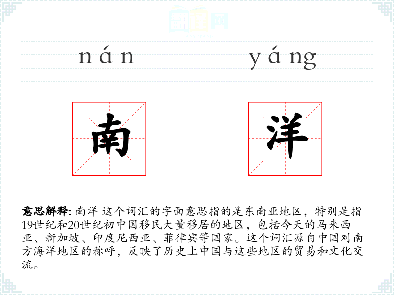 南洋 这个词汇的字面意思指的是东南亚地区,特别是指19世纪和20世纪初移民大量移居的地区,包括今天的马来西亚、新加坡、印度尼西亚、菲律宾等国家。这个词汇源自对南方海洋地区的称呼,反映了历史上**与这些地区的贸易和文化交流。
