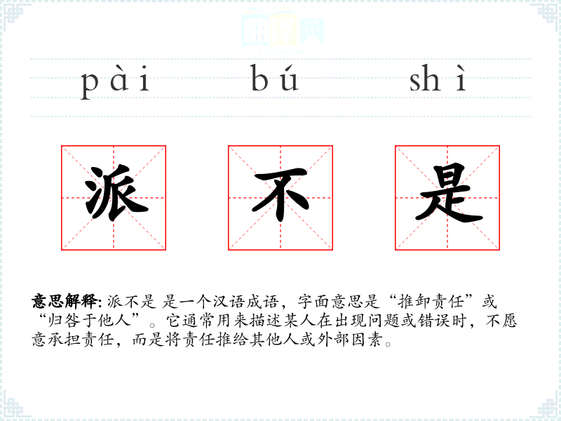 派不是 是一个汉语成语,字面意思是“推卸责任”或“归咎于他人”。它通常用来描述某人在出现问题或错误时,不愿意承担责任,而是将责任推给其他人或外部因素。